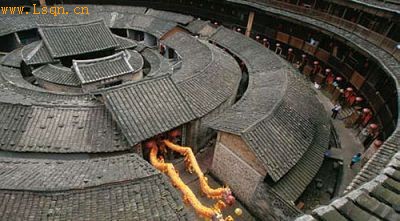 “高四层,楼四圈,上上下下四百间;圆中圆,圈套圈,历经沧桑三百年”。图为土楼与商业活动“亲密接触”。