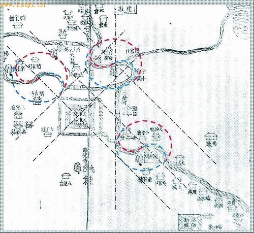 李大华说,太极图是宇宙万物运化的全息稳态模式,也是中国的哲学精华,生动地表示了宇宙万物的结构及其运动规律。有与无,动与静,天与地,昼与夜,夏与冬,南与北,左与右,正与负,合与分,进与退,盛与衰,生与死等,都可以从中找到解释。从图中可以看出,天津卫城选址明显受到三太极图的轴线(过大圆圆心和两个内切小圆圆心的直线)、切线(平行于轴线)和鱼眼线(分别过两个内切小圆圆心的直线)控制,直线的交点很好地表达了天津卫中心(鼓楼位置)、城墙对角线,护城河角等特征点,说明自然河道的三个太极图与天津卫城选址具有密切关系。因为纵观全图,只有两处河段方向规整,即图中呈南北向的一段,大致是今天北安桥(南)——东北角长途汽车站(北)一段;呈东西向的一段,大致是今天东马路——大丰路一段。李大华解释说,天津卫城选址在此,四堵城墙分别与上述两段河段平行,既背有河水依托,又被三个太极圈环抱其中,是全城惟一的完美点。
