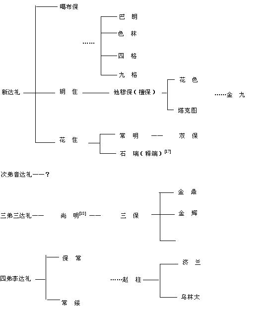 关于金家的世系与政绩,《雪屐寻碑录》卷十二辑入了新达礼和花住父子两块神道碑铭,在同名为《皇清洁赠光禄大夫佐领兼总理内务府三旗火器营事务金公神道碑》的碑文中,均有记述。再参佐《通谱·金氏》、《八旗通志》卷四旗分志四、《国朝耆献类征·金简传》等文献,金氏新达礼家族世系流衍如下图。