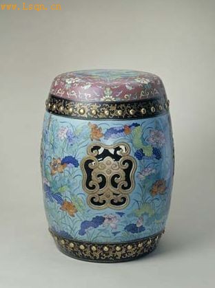 高52.9cm,面径31cm。 墩面径、底径相若,器身长圆,呈鼓形,有四云头形镂空装饰。墩面为紫地轧道粉彩装饰,其中心为天蓝地斗彩装饰。器身大面积的荷莲纹为蓝地斗彩加绘粉彩,釉上填矾红、绿、蓝、白、紫、青花等彩料。上下各有一周紫地金彩鼓钉。 绣墩盛行于明清两代。此绣墩为乾隆时的代表作品,制作精美,应用了多种彩饰工艺,而层次分明,使绣墩端庄古朴的造型透出几分俏丽的情调。色地上以斗彩进行装饰本已艳丽,此器又增加了轧道粉彩工艺,愈显奢华。
