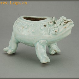 器身为三足蟾形,昂首直立,背部开口,中空。蟾头采用堆贴、刻划花装饰,三足采用捏塑、粘接、刻划花手法,背部模印细密乳丁纹。白胎,施青白釉,蟾眼部以褐釉点彩。三足足底无釉露胎。此器系手工随意捏塑而成,装饰繁缛,细部刻划富有神韵,可谓匠心独具、刻意求工的瓷塑佳作。