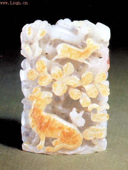 秋山玉则反映了辽金秋猎活动。多以俏色玉表现秋天树叶泛黄的情态,以镂空工艺雕琢山、林、鹿、熊、虎等野兽,风格写实,情趣盎然。