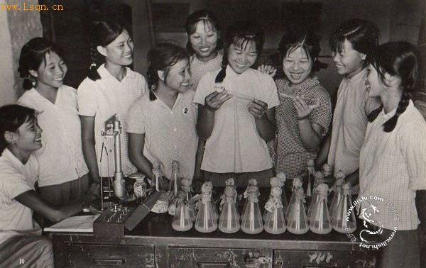 “学制要缩短,教育要革命,资产阶级知识分子统治我们学校的现象,再也不能继续下去了。”在毛主席无产阶级革命路线指引下,一场深刻的无产阶级教育革命正在蓬勃开展。广州市第三十二中学落实毛主席的《五七指示》,创办了农村分校。这是三十二中的同学和社员在查看自己生产的新型农药。