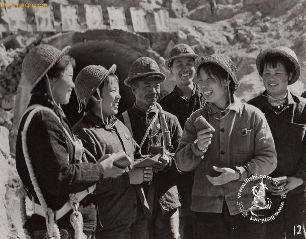 用毛泽东思想武装起来的先进矿工,在矿山建设工地上成批涌现。这是太钢铁矿在排除六号隧道八次大塌方中英勇战斗的赵巧然(右二)和工人一起交流活学活用毛泽东思想的体会。