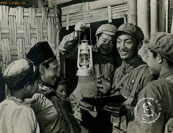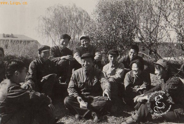 英雄的大庆人在毛主席无产阶级革命路线指引下,发扬“自力更生”,“艰苦奋斗”的革命精神,把万顷荒原变成了富裕的良田。这是老标兵薛桂芳(右前站立者)向家属生产队讲述大庆油田会战初期五把铁锹闹革命的情景,进行油田会战的传统教育。