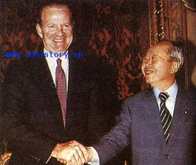 美国从4月17日起,对日本输往美国的彩色电视机、小型计算器等电子产品征收100%的惩罚性关税(总值3亿美元)。美国指控日本违背两国去年7月签订的半导体协议,廉价倾销芯片,严重危害美国半导体工业的发展和竞争力。这是二次大战以来美国对日本首次实行报复性经济制裁。日本当日向美国提出抗议,并以美国违反关税及贸易总协定为由提出申诉。图为日本大藏大臣宫泽喜一在华盛顿同美国财政部长贝克举行紧急磋商时情景。