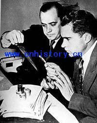 尼克松(右)和助手查看希斯的间谍照片底片,这张照片被美国媒体广为刊登,为尼克松捞足了*资本。