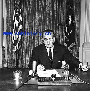 美国总统约翰逊正在签署扩大越战的命令。