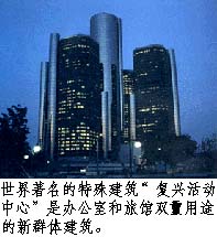 市中心区位于底特律河畔,商业、金融和各种办公机构的建筑物密集,主要街道呈辐射状向外延伸,与穿行于市内的高速公路相交织。近十多年来对老市区进行改造,兴建一系列交通、住宅、医疗、文化等设施,最著名的是耗费巨资建造的复兴中心大厦,是由4幢39层、1幢73层大楼组成的圆形塔式建筑群,内设商场、旅馆、饭店和各种游乐设施。市郊高级住宅区建有一批新的商业中心。市内多博物馆和图书馆。著名的“亨利·福特汽车博物馆”位于迪尔伯思绿地村,陈列上千种实物,展示美国汽车工业发展史。