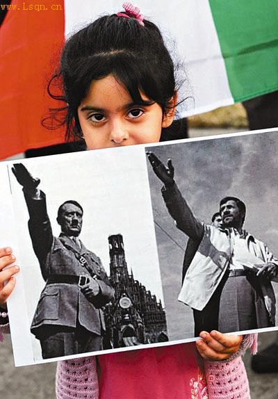 早前反内贾德示威曾出现将他和纳粹魔头希特勒相提并论的海报,以谴责他的反犹太人立场。(资料图片)
