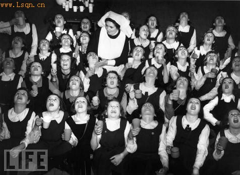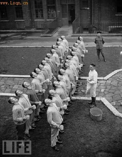 1941年,一所英国学校的学生在护士监察下用常规漱口药漱口。