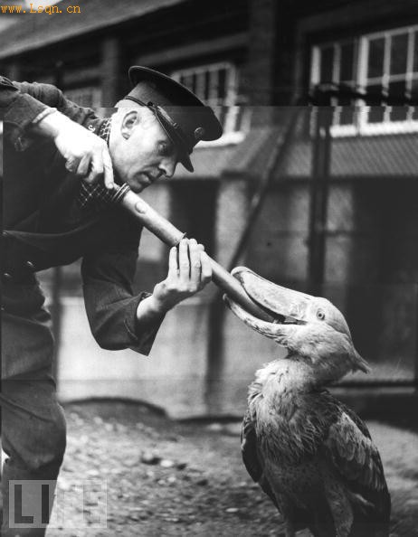 1936年:在伦敦动物园一名工作人员正用一个注射器里对着鲸头鹳的喉咙。