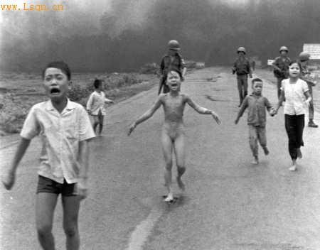被燃烧弹烧着的女孩惊恐万状地逃命,她的身边是一群无动于衷的美国大兵。