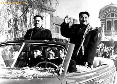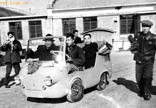 1958年11月23日,金日成首相(左二)在周恩来总理陪同下乘坐清华大学师生设计的微型轿车