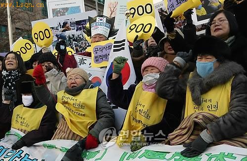中新网1月13日电韩国挺身队问题对策协会(以下简称挺身队协议会)13日下午12点在日本驻韩国大使馆前举行了第900次周三集会。