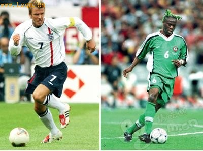 左:贝克汉姆在2002年世界杯上的莫西干发型影响了数亿人。右:尼日利亚后卫韦斯特怪异的发型无人能出其右。(图片来源:中国网)