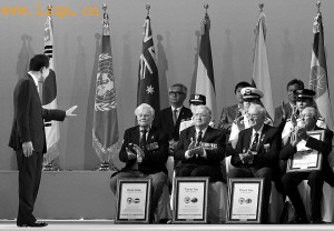 李明博昨天在纪念活动中接见参加过朝鲜战争的各国老兵,并向他们颁发感谢函。来源:东方早报