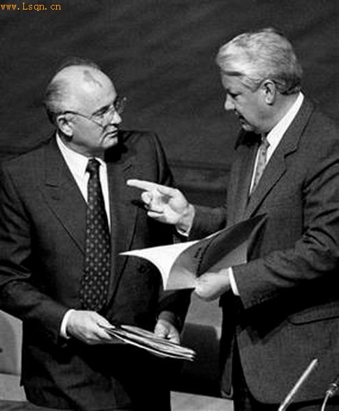 图为1991年叶利钦和戈尔巴乔夫在一起。