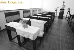 用白布铺盖的桌子就是金日成当年用的课桌(图片来源:东亚经贸新闻)