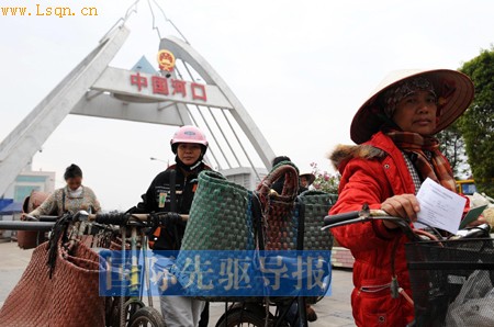 越南边民在中越边境的口岸排队进关,准备购买商品回越南销售。(摄影:尹鸿伟)