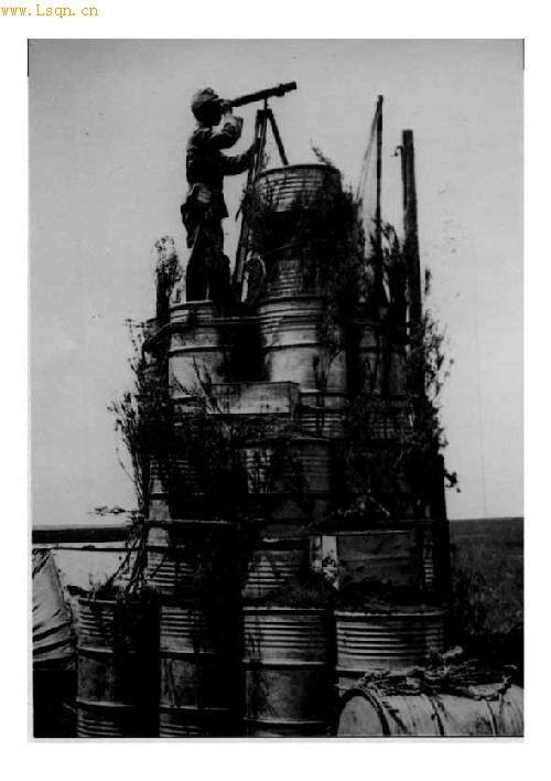 日军的观测哨,处于较低地势的日军只能用汽油桶垒起高台监视对方,虽绑上树枝加以伪装,但在一望无际的草原上,孤零零地突兀着这么一个怪物,必然成为苏军首先打击的目标。(出自《昭和史》·14~15年,每日新闻社)