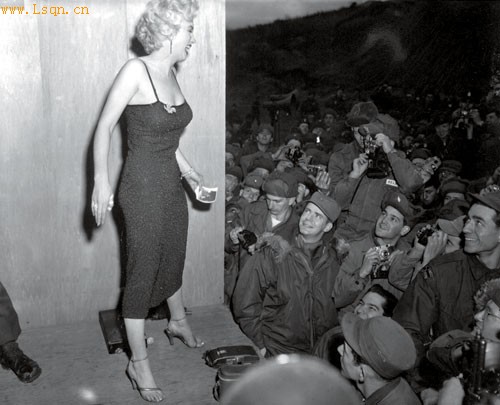 1954年2月17日,电影明星玛丽莲·梦露到韩国为美国步兵第三师的官兵们演出,表演者结束后在后台摆出各种姿势接受美军士兵拍照。在零下几十度的冰天雪地,梦露穿着一袭裸露的长裙,载歌载舞地演出了10场。“我必须让他们看到他们想看的”,梦露说。慰问演出结束后,梦露因为风寒发烧了一周。
