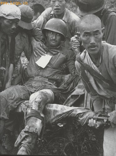 一个美国海军陆战队士兵正在被一群韩国志愿者救起,他们用的担架是用从人民军那里缴获的步枪做成的。就是这样一个受重伤的士兵,用他的微弱的声音恳请他的队长:“请让大家不要后退,无论他们用什么攻击你。”