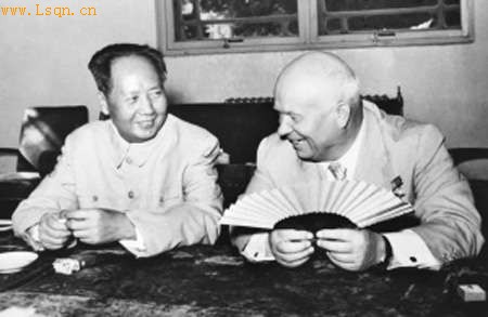 毛泽东[注: 毛泽东(1893年12月26日-1976年9月9日),字:润之,笔名:子任,曾用名:二十八画生、李德胜,国际共产主义运动卓越的领导者,政治家、军事家。]与赫鲁晓夫 来源:新华网