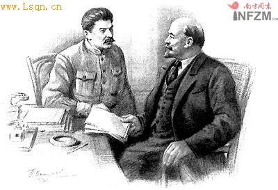 斯大林与列宁[注: 列宁(俄文:Ле?нин),公元1870-1924,本为笔名,后成为他在政治活动中的别名,原名为弗拉基米尔?伊里奇?乌里扬诺夫(俄文Влади?мир Ильи?ч Улья?нов),] 来源:南方周末