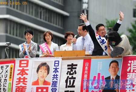 2010年6月24日,东京[注: 东京是日本的首都,是一座现代化的国际都市。东京位于本州关东平原南端,总面积2187平方公里,人口约1254.4万(2005年),是世界上人口最多的城市之一。]街头,日共委员长志位和夫(左四)带领候选[注: 清制,内自郎中,外自道员以下官员,凡初由考试或捐纳出身,及原官因故开缺依例起复,皆须赴吏部报到,开具覆历,呈送保结。吏部查验属实,允许登记后,听候依法选用,称候选。]人向选民拉票。(来源:国际先驱导报)