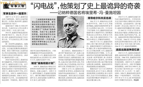 核心提示:1940年2月1日,曼施坦因出任德军第38军军长。法国战役中德军装甲洪流滚滚席卷而下,英法联军全线崩溃,英军从敦克尔克狼狈撤回英国,法国很快沦陷。曼施坦因因此获得骑士勋章。