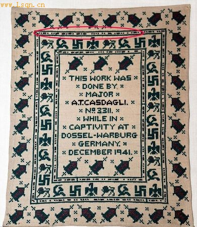 核心提示:当时被德国纳粹俘虏的英军少校亚力克西斯·加斯达戈里在战俘营里用从降落伞上扯下来的丝线刺绣,但谁知他却用摩尔斯电码在其中绣上了“上帝保佑国王,F***希特勒[注: 阿道夫·阿道夫·希特勒,奥地利裔德国政治人物,1921年成为纳粹党党魁,1933年被任命为德国总理;1934年成为德国元首。]”的内容,而纳粹德军未发现蹊跷,还将其作品在战俘营里展出达数年之久。