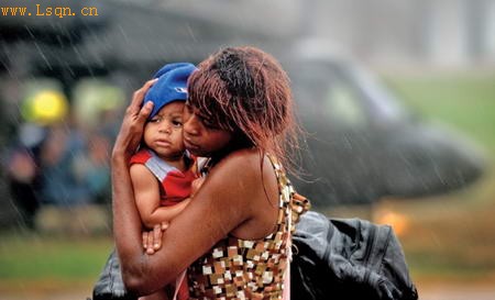 在“卡特里娜”飓风于2005年8月29日袭击墨西哥湾地区三天后[注: 天后 天后1.妈祖的别称,为中国沿海地区、台湾、东南亚沿海华裔居民普遍信仰的海神。 妈祖(俗名林默,生卒年不明),祖籍中国福建省莆田湄洲岛,为一传奇性的宗教人物。],巴哈姆抱着她的女儿走下直升机。直升机将她们从新奥尔良飓风灾区转移了出来。