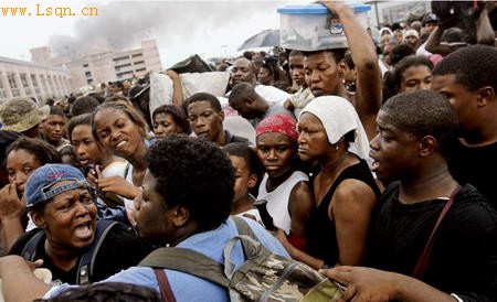 数千名疲惫的飓风灾民在新奥尔良的超级穹顶体育馆外等候将他们撤离至休斯顿的巴士。灾民的队伍很长,而且人们的耐心也到了极限。
