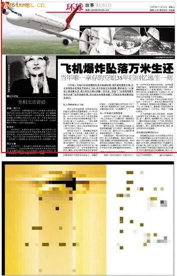 本文摘自:《青年时报》2007年11月20日A16版,作者:佚名,原题为:《飞机爆炸坠落万米生还 当年唯一幸存的空姐35年后回忆逃生一刻》