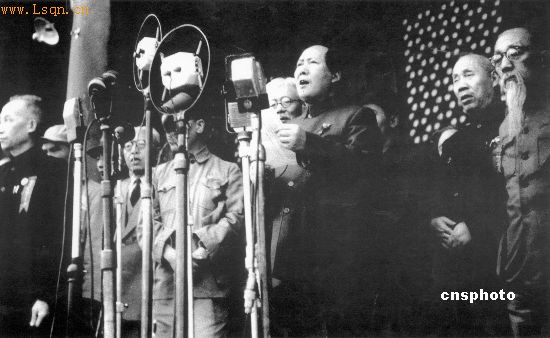 1949年10月1日开国大典,毛泽东在天安门城楼上向全世界庄严宣告:“中华人民共和国中央人民政府今天成立了。”图为毛泽东在宣读中华人民共和国中央人民政府公告。