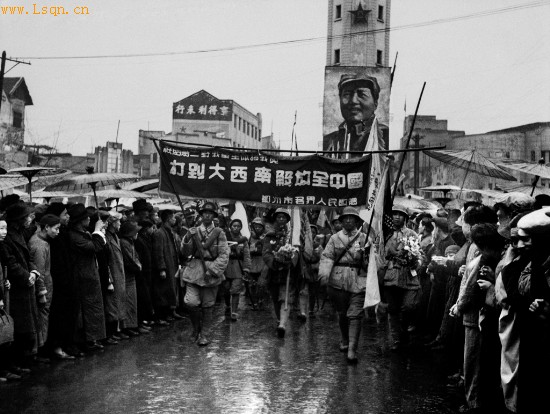 1949年11月30日,第一批进驻重庆的人民解放军在市区街头受到市民夹道欢迎