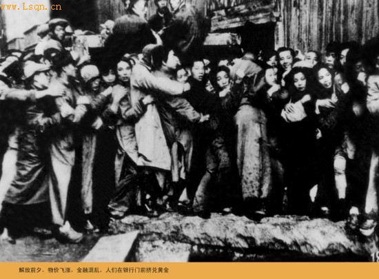 解放前夕,物价飞涨,金融混乱,人们在银行前挤兑黄金。