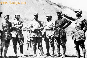 1942年4月,朱德总司令视察南泥湾。左起:左齐、邱创成、贺龙、 朱德、王震、谭文邦