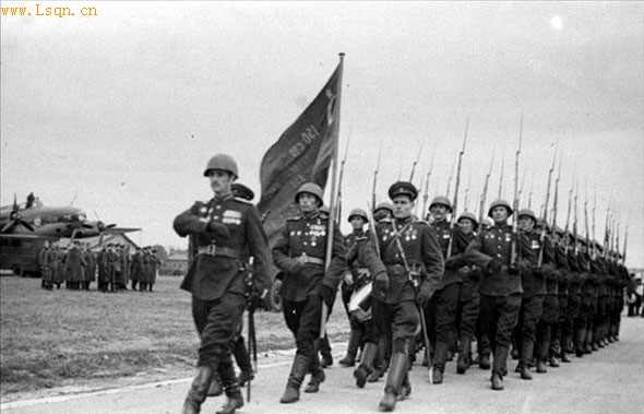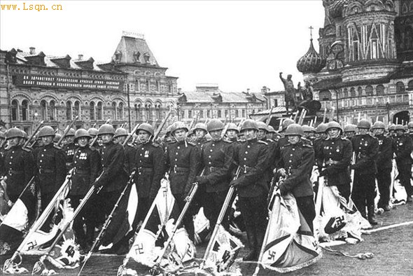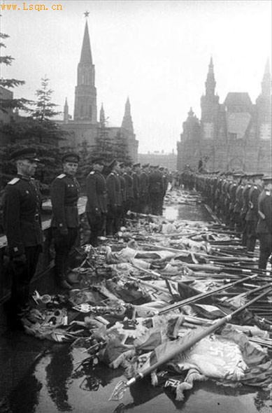 1945年6月24日,苏军在莫斯科红场举行胜利大检阅,显示自己的强大威力。 在这次阅兵式上,红军战士将在战场上缴获的数百面德军军旗掷到了列宁墓前,重演了历史上俄军将缴获的拿破仑军旗掷到亚历山大一世沙皇脚下的光辉一幕,阅兵仪式达到了高潮。