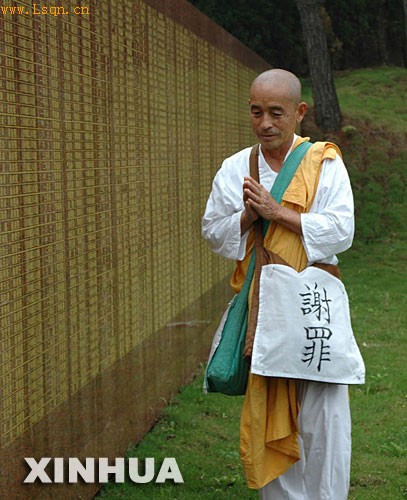 资料图:2006年4月25日,日本僧人岩田隆造在武汉会战阵亡将士英烈榜前祈祷忏悔。新华社记者 戴劲松摄