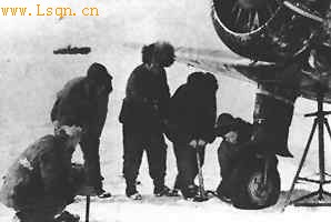 图:我空军航校建立初期,用自行车气筒给飞机轮胎打气