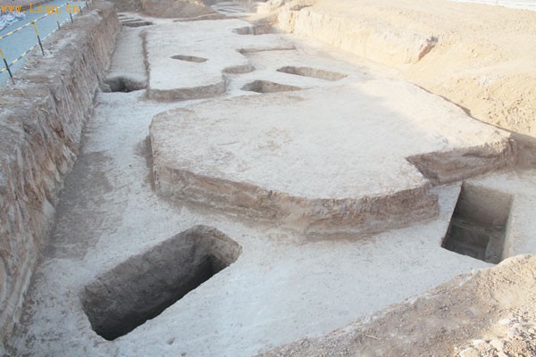 土坑竖穴墓6座。形制较简单,有的带有器物箱。随葬品有陶壶(或陶罐)1对、少量铜钱(大部分为五铢钱[注: 中国古代记重货币。主要行使于两汉、魏晋南北朝,至唐高祖时期止。-wuzhuqian],其中M8等墓只出土“大泉五十”),有的还随葬有铜镜、铜带钩等。其中M6在墓底和填土下半部填有大量残碎的陶片、瓦片;M7下部南北两侧整齐排放大量砾石。根据墓葬形制及出土器物推断这些墓葬时代为西汉中晚期至东汉[注: 东汉(公元25年~220年),又称后汉,是中国古代继秦朝和西汉之后的又一个大一统王朝,由光武帝刘秀建立。二十四史中的断代史—《后汉书》,即记载了上起光武帝,下至汉献帝的东汉一朝共196年历史。WWW.LSQn.CN]早期,其中个别墓的时代可能确定为新莽时期。