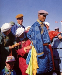 鄂尔多斯蒙古族新郎以及迎亲队伍到达新娘家后,总会被女方家当作上宾热情招待,大家在一起又吃又喝又唱又跳,好不热闹,这时,男方祝颂人会悄悄地离开宴席领着新郎来到新娘的房间里。待他俩在客位上坐下以后,陪娘们就会端上来一个煮熟了的羊脖子招待新郎,并请新郎把羊脖子从中间掰断,以试新郎的力气大小。为了戏弄新郎,陪娘们早就将一根红柳棍或一根铁棍子巧妙地插进羊脖骨髓道里。新郎如果事先有人指点,他就会识破其中奥妙,取出柳棍或铁棍,很容易地将羊脖子掰断。有的新郎则不识其中秘密,因而费尽力气,弄得满头大汗,像狗咬乌龟一样,又着急,又羞愧。而陪娘们则趁机用十分辛辣刻薄,但不怀恶意的语言挖苦,取笑新郎。被讥笑得满脸通红的新郎,此时 < 1 > < 2 > |