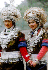 苗族分布较广,支系众多。服饰有明显的地域差异。妇女较典型的装束是短上衣,百褶裙。苗族衣料过去以麻织土布为主,普遍使用独具特色的蜡染、刺绣工艺。裙子以白色、青色居多,服饰的用料、颜色、款式、刺绣等方面,都极具民族风格。配饰以头、颈、胸及手等部位的银饰为多见,苗族的银饰在各民族首饰中首屈一指。绚丽多彩的服饰文化充分显示了苗族的聪明才智,至今仍保持自己的民族特色。