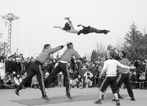 庙会上惊险的杂技表演。龚文豹 摄