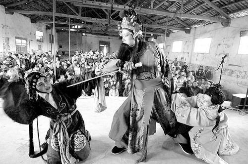 历史剧20余本,创作现代戏10余台,记录、整理了戏曲腔谱60余种,一批业余宁河戏曲班活跃在民间,成为当地群众文化的一道独有风景。图为修水县全丰镇宁河戏农民剧团的演员在为村民演出传统剧目《陈世美》。