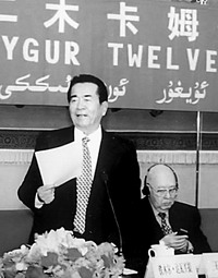 铁木尔·达瓦买提在人民大会堂召开的维吾尔十二木卡姆研讨会上讲话。艾力肯摄