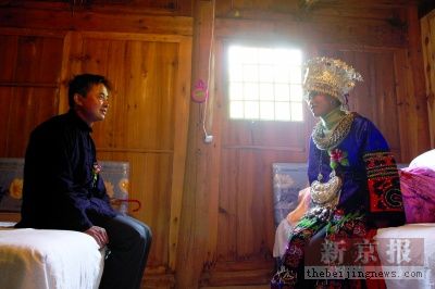 11月12日苗年节的第3天,得知郎德上寨有古歌对唱表演,我清早就驾车从县城出发。离郎德上寨还有3公里左右时,一位身着盛装沿路边疾走的苗家女孩告诉我自己正忙着去为好友送嫁。我立即改变原定采访计划,同这位叫小楠的姑娘一起参加婚礼。路上小楠告诉我,新人对外乡人去参加婚礼一定会很高兴,就是希望在拍照前征求他们的意见。