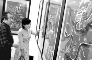 72岁的汉绣大师任本荣(左)在向参观者介绍汉绣作品“九龙腾飞”。